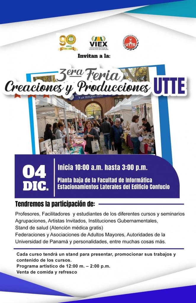 🎶 Este jueves 4 de diciembre, de 10:00 a.m. a 3:00 p.m., te invitamos a la 3era Feria de Creaciones y Producciones UTTE, organizada por la Universidad del Trabajo y la Tercera Edad (UTTE) de la Vicerrectoría de Extensión de la Universidad de Panamá (VIEX) 🎓.