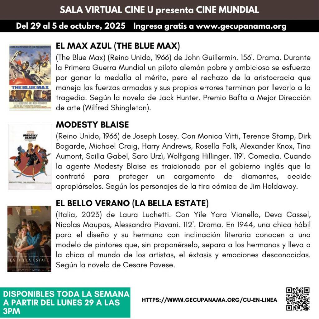 🎥 ¡Tres películas, tres épocas, tres formas de ver el mundo! #CineMundial #SalaVirtualCineU #CineBritánico #ModestyBlaise #TheBlueMax #LaBellaEstate #CineGratis #CinePanamá #CulturaQueInspira