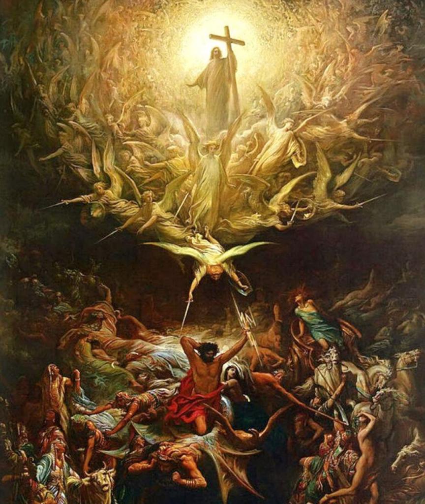 "Triunfo del cristianismo sobre el paganismo" (1868?), por Gustave Doré. Cristo, cargando la cruz, rodeado por un ejército de ángeles que forman un círculo, listos para atacar a los falsos dioses de todo tipo. Óleo sobre lienzo. 118 x 79 in.
